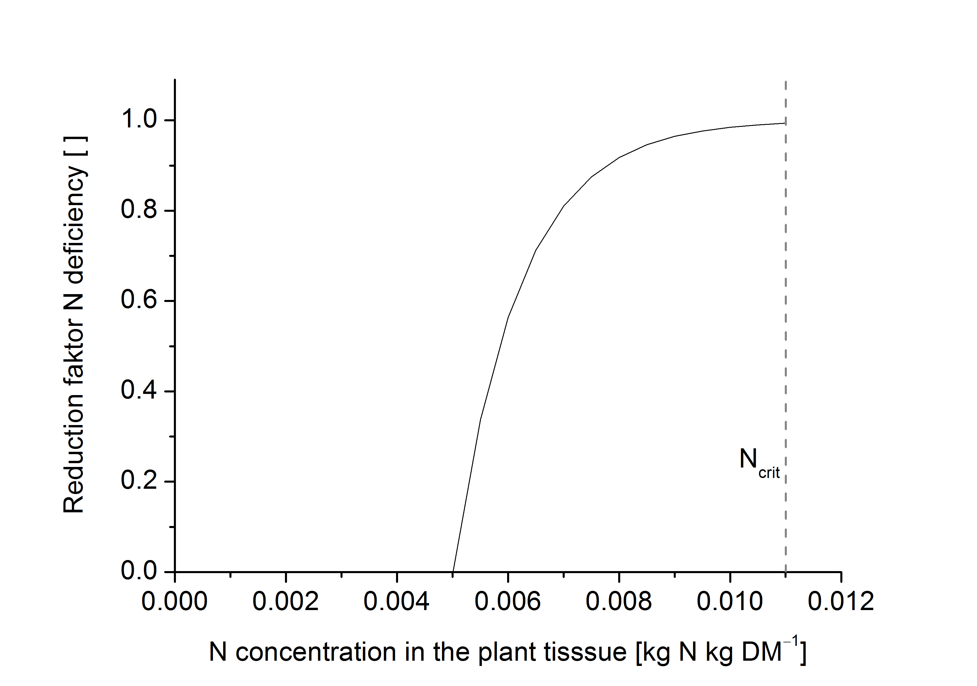 Nitrogen deficiency is indicated as soon as the crop’s tissue N concentration falls below the critical N concentration. The respective reduction factor results from: