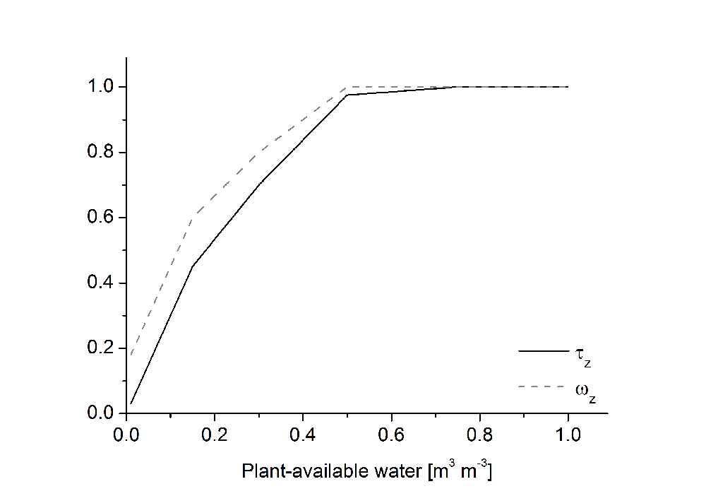 Figure 1: Reduction function for transpiration (\(\tau_z\)) and for root water uptake efficiency (\(\omega_z\)) in dependency of water availability in the respective soil layer.
